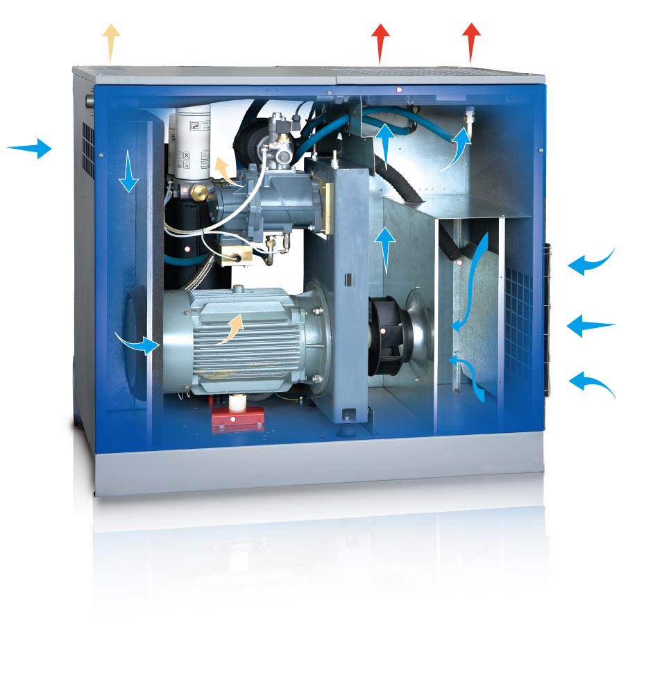 壓縮機(jī)冷卻系統(tǒng)由安裝在主電機(jī)上的大排量風(fēng)扇提供冷卻風(fēng)量,無(wú)需另裝專(zhuān)門(mén)的冷卻風(fēng)扇,減少運(yùn)動(dòng)部件,降低故障因素,使機(jī)器運(yùn)行更加可靠。